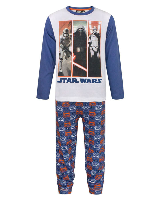 Officially licensed, these Star Wars pyjamas are a perfect way to relax in Star Wars style! These pyjamas come in a long sleeve top and long bottoms combination, and are made with a soft and comfortable feel perfect for bedtime. The front of the top sees a large split-panel print, one panel featuring a Stormtrooper, one panel featuring Kylo Ren, and the third panel featuring Captain Phasma, and all underlined by the Star Wars logo in blue. The white body panels of the top are complimented by blue sleeves and collar. The bottoms come in a matching blue and offer a long length with elasticated waist for comfort, complete with an awesome repeated design featuring a Stormtrooper helmet in orange and white. Please follow all care label instructions carefully and ask for additional sizing information if needed for this product.. Officially licensed merchandise. Long Sleeve. Crew Neck. Regular. Official Star Wars The Force Awakens merchandise.
