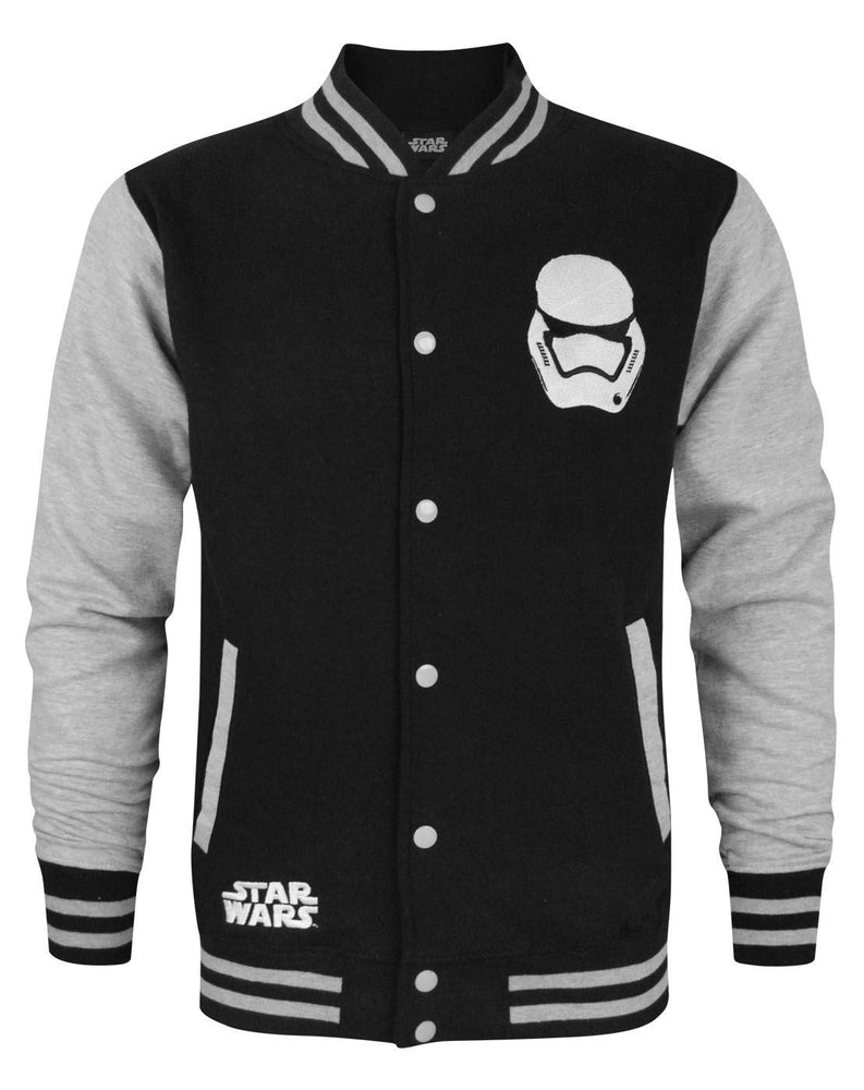 Add some Star Wars style to your life with this awesome official Star Wars Force Awakens First Order Stormtoooper Mens varsity jacket! A must have for fans of the iconic cinema franchise this varsity jacket is packed with awesome details making it a stand out product. This jacket follows a classic varsity style with contrasting sleeves and body in grey and black, the neck, cuffs and hem come in a striped look. The jacket has grey popper detail, side pockets and a cool Stormtroopers PVC patch across the chest. The Star Wars logo can be seen in white across the bottom in an embroidered style adding to the premium look of the garment. This jacket offers a standard mens fit and finish with official branding and tags, please follow all care label instructions carefully before use.