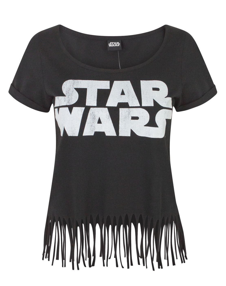 Mix up your style with this awesome Star Wars Logo Fringe t-shirt! This fashion t-shirt offers a cool twist on the classic t-shirt style, with rolled sleeve detail this top has a stylish fringe effect around the bottom perfect for capturing a festival inspired fashion feel. This Star Wars womens t-shirt sees the classic logo across the front in a washed out white colour adding a cool vintage inspired look set against the black of the t-shirt. Alongside this the t-shirt has a slouched neck offering a wider fit, this t-shirt reaches approximately waist length with the fringe design falling below. Please follow care label instructions carefully and ask for additional product information if needed.