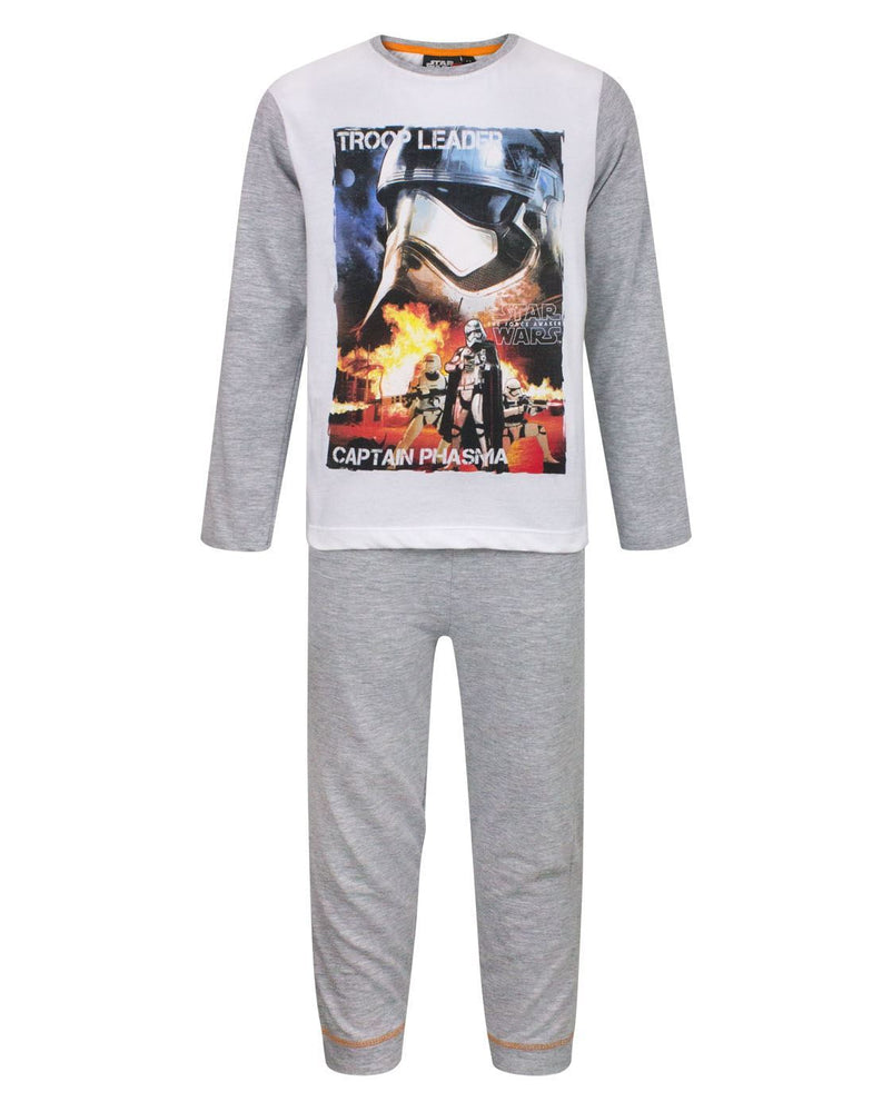 Join the Dark Side in these sweet Star Wars The Force Awakens Captain Phasma pyjamas for boys! Officially licensed, these Star Wars Captain Phasma pyjamas are a perfect way to relax in Star Wars style! These pyjamas come in a long sleeve top and long bottoms combination, and are made with a soft and comfortable feel perfect for bedtime. The front of the top sees a large image of Troop Leader Captain Phasma, leaving flames in her wake, with a closeup of her helmet in the far background. The white body panels of the top are complimented by grey marl sleeves and collar and matching bottoms; the bottoms offer a long length with elasticated waist for comfort. Please follow all care label instructions carefully and ask for additional sizing information if needed for this product.