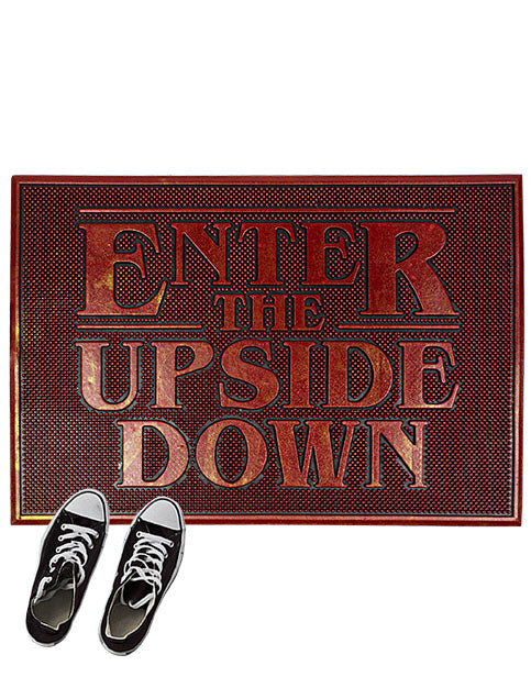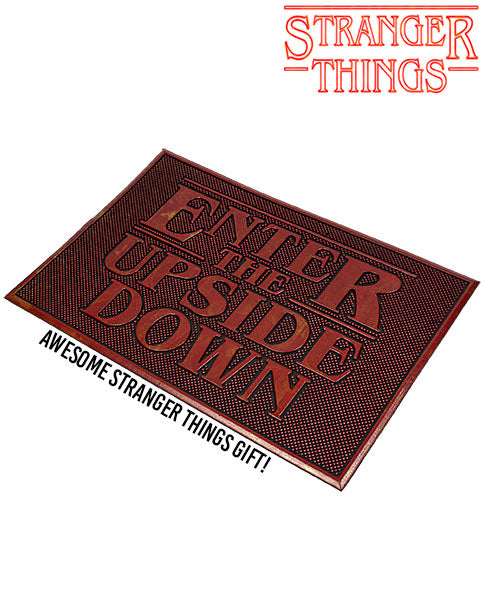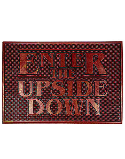 - STRANGER THINGS DOORMAT 60CM x 40CM – Perfect for Netflix Stranger Things series lovers; this red metallic rubber doormat features bold text reading ‘ENTER THE UPSIDE DOWN’ making an awesome addition to fans Stranger Things homeware merchandise collection.