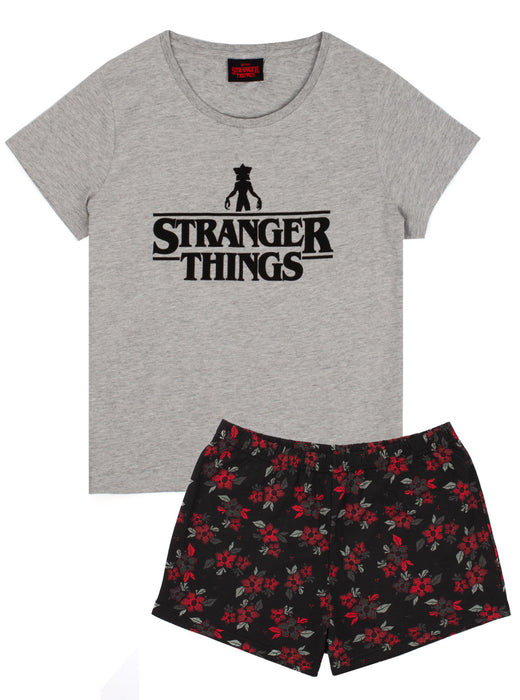 - GREY STRANGER THINGS LOGO TOP & DEMOGORGON FLOWER BOTTOMS - The Stranger Things pyjama top comes in grey with a cool Stranger Things logo that features a silhouette of the monster, the Demogorgan. The black bottoms come with an all over print featuring Rafflesia Arnoldi flowers that resemble the Demogorgon Monster making an awesome must have gift for Stranger Things fans!