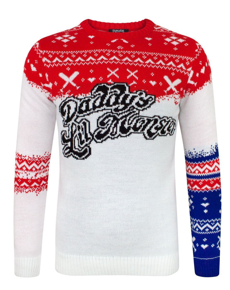 Looking for a Christmas jumper with a twist? Look no further than this DC Comics Suicide Squad Daddys Lil Monster jumper! A fun spin on the now iconic Harley Quinn print this Christmas Jumper is a cool superhero addition to your Christmas wardrobe! The design across the front sees the Daddys Lil Monster design along with a cool crossed bat detail in a fun Christmas style. This jumper comes in red and white with a flash of blue on the sleeve tying the look together! Made in a fun knitted style this Chistmas jumper offers a regular fit with official branding throughout. Please follow care label instructions carefully.