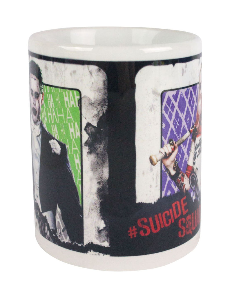 Sip in Suicide Squad style with this awesome official Suicide Squad ceramic mug! This Joker and Harley Quinn mug sees Margot Robbies version of the iconic Harley Quinn along with Jared Letos Joker on the other side. The print has great attention to detail with bright colours and a sharp finish; the Suicide Squad logo can also be seen in red across the front. This mug comes in white and holds approximately 110z and measure approximately 4in in height. This mug is microwave and dishwasher safe however please follow all washing and care instructions carefully before use.