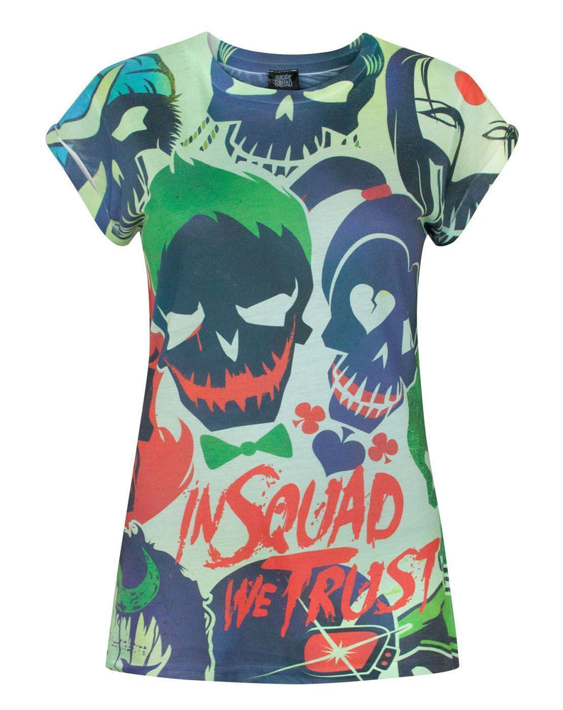 Be part of the Suicide Squad in style with this awesome official Suicide Squad Sublimation t-shirt! The perfect way to celebrate DC's most deadly villains, this t-shirt has an all over print across the front of the t-shirt featuring the icons for all of the supervillains in the Task Force in an awesome, colourful print, complete with the slogan ÐIn squad we trustÓ at the bottom of the image. This print has great attention to detail with an all-over styled print, perfect for fans of the movie. This t-shirt offers crew neck and short rolled sleeves, and a standard women's fit; the back of this t-shirt is plain white. Please also be aware that the sublimation process means that every t-shirt is printed individually so every product is 100% unique. From time to time, you may see white marks under the arms and along the seams. This is where the t-shirt fabric bunches up slightly during the application process. Although the image we provide is just an example of 1 individually printed t-shirt, it is an accurate representation of the quality garment we provide. Please follow all care labels carefully and ask for additional sizing if needed.