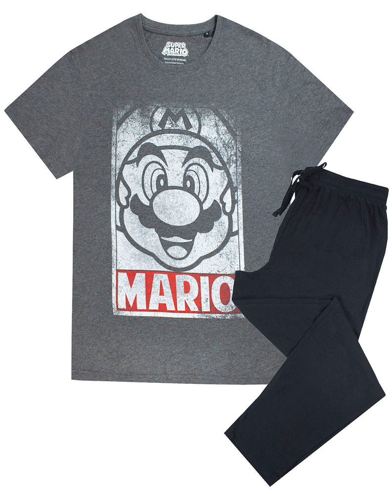 - MARIO POSTER DESIGN TEE & SWEATPANTS - Super Mario pyjamas for gamers features a distressed Mario poster print for a retro feel. The grey t-shirt is great quality and is suitable to wear not only as a pyjama top, but also to wear out on summer days. Matching black lounge pant bottoms are perfect for gaming!