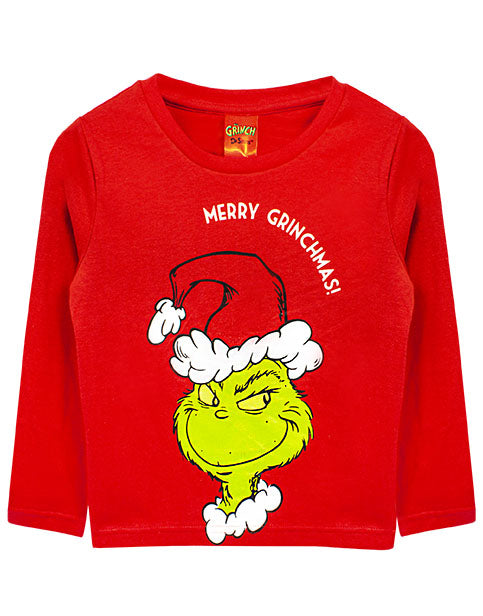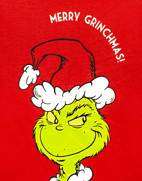 - DR SEUSS THE GRINCH "MERRY GRINCHMAS" PRINT - These sets feature long sleeve and crew neck t-shirts, red for females and grey for males, with the character who stole Christmas; The Grinch on the front and an all over print of the loveable character on the stripy full length bottoms.