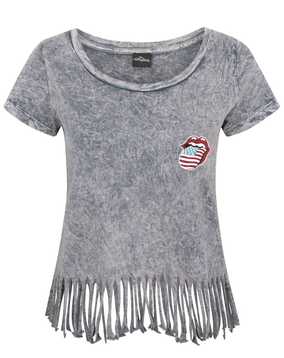 Perfect for any rock n roll fan, this The Rolling Stones women’s acid wash fringe tee is the perfect addition to anyones wardrobe! Oozing rock n roll style, this tee features a small print of the iconic tongue logo on the chest, along with a large back print featuring artwork from the 1981 Rolling Stones North American tour with an overall distress effect. Made from 100% cotton, this grey acid wash tee offers a regular ladies fit with short sleeves and a crew neck along with fringe detail. This t-shirt reaches approximately waist length with the fringe design falling below. To ensure you get the most out of this t-shirt, please follow care label instructions carefully.