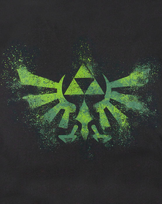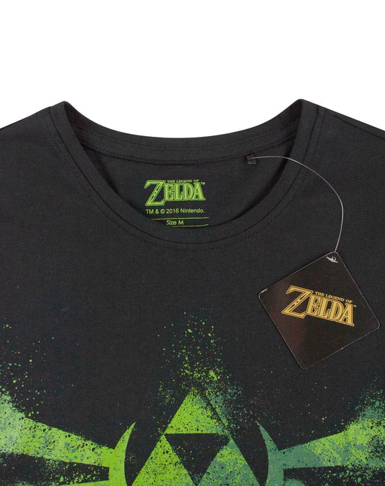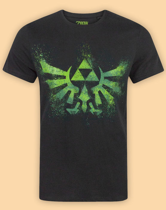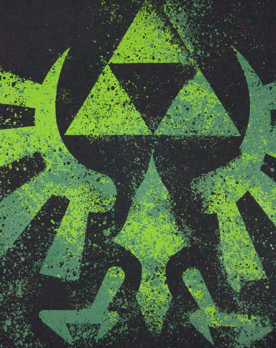 Add some Hyrule vibes to your wardrobe with this awesome Zelda Green Triforce logo mens t-shirt! The large print across the front of the t-shirt showcases the iconic Hylian crest, the logo of the Hyrule royal family in vivid colourful detail. Featuring a distinctive spatter effect in vibrant green, this print is a must-have for any Zelda fan!This detailed print has a cool look set against the black of the t-shirt. This t-shirt offers a crew neck and short sleeves detail along with a standard fit and feel. Please follow care label instructions carefully.